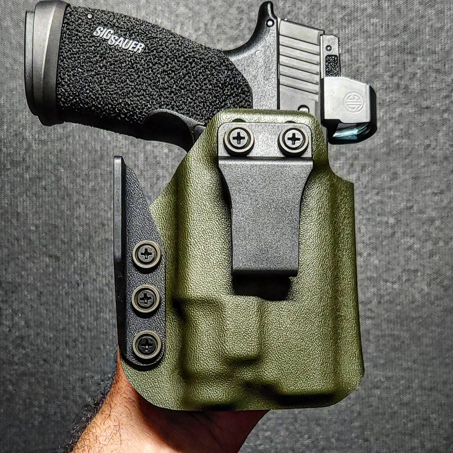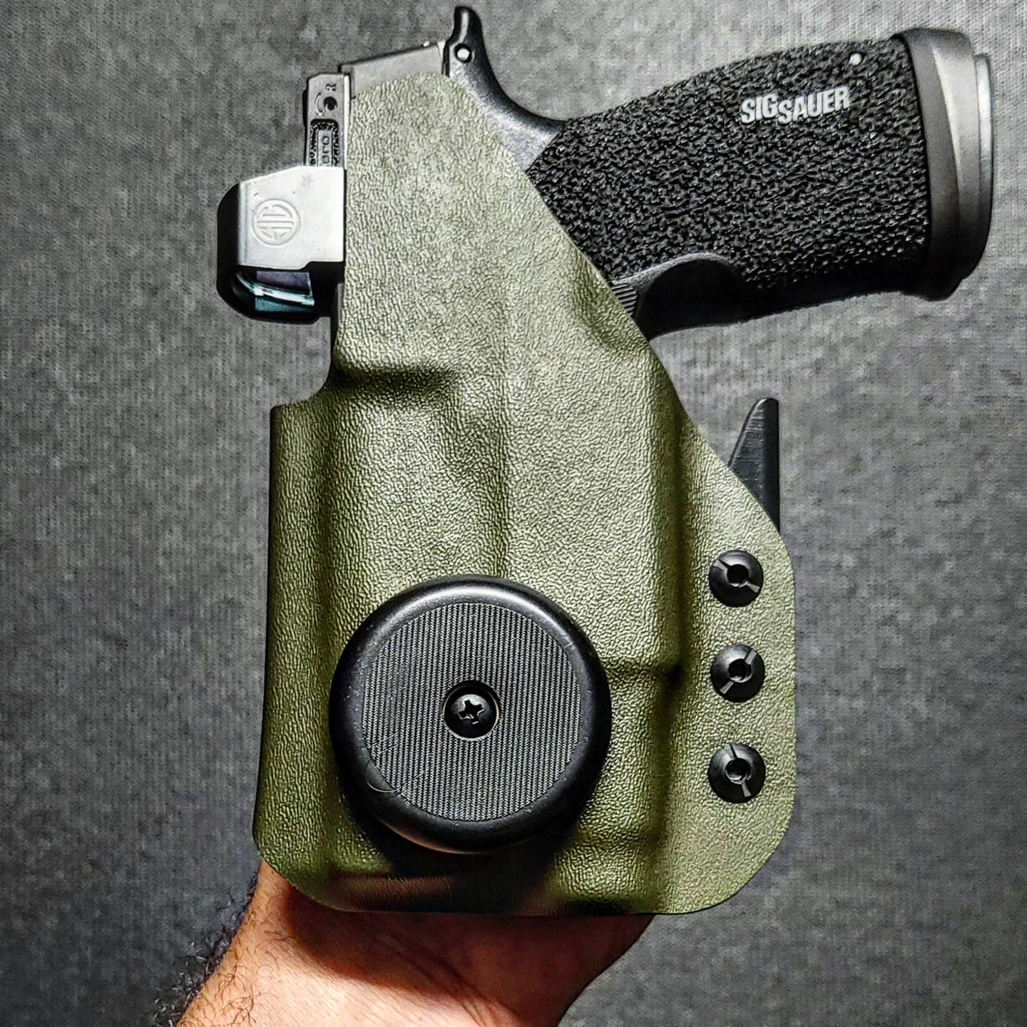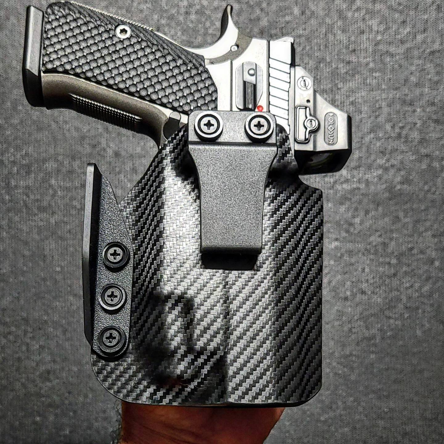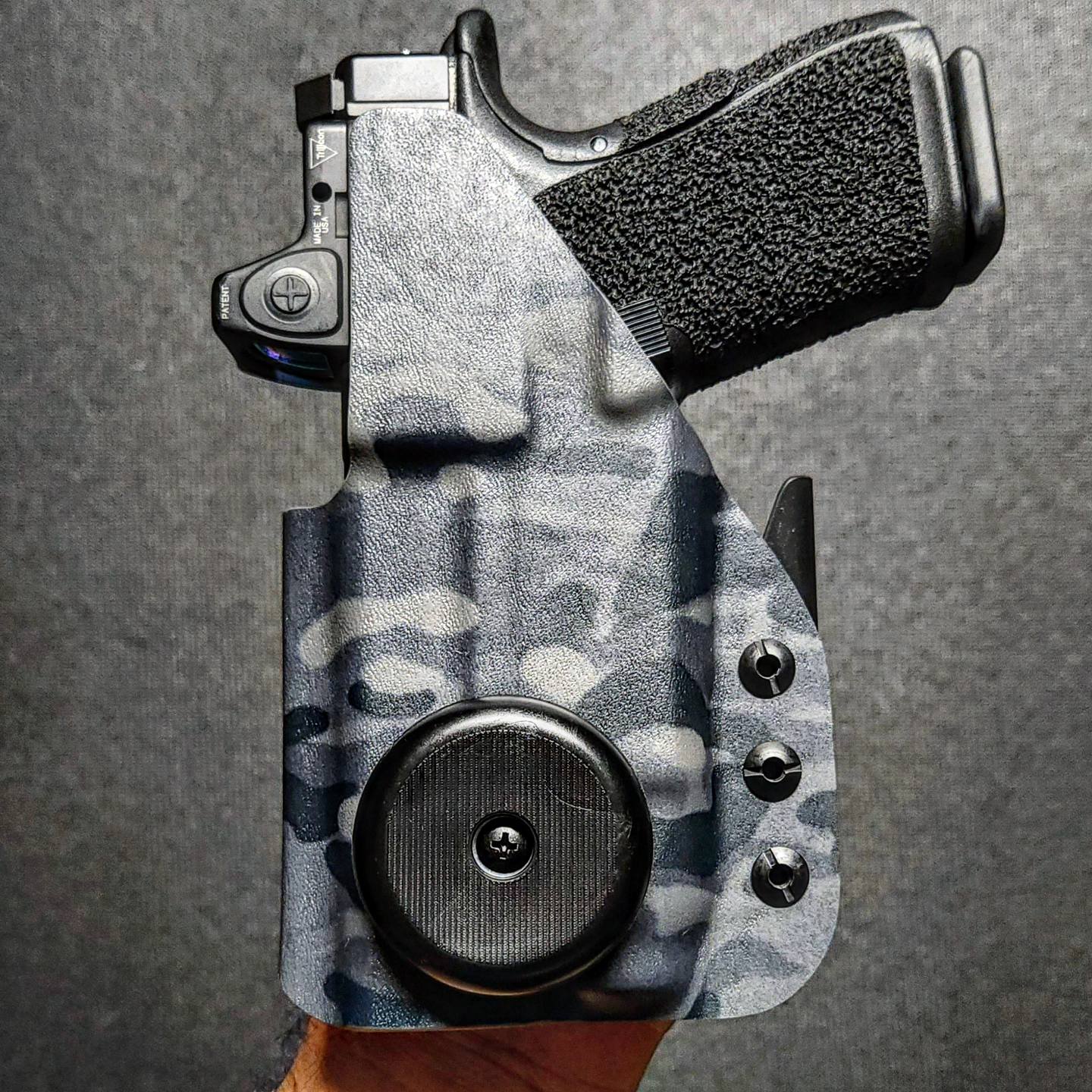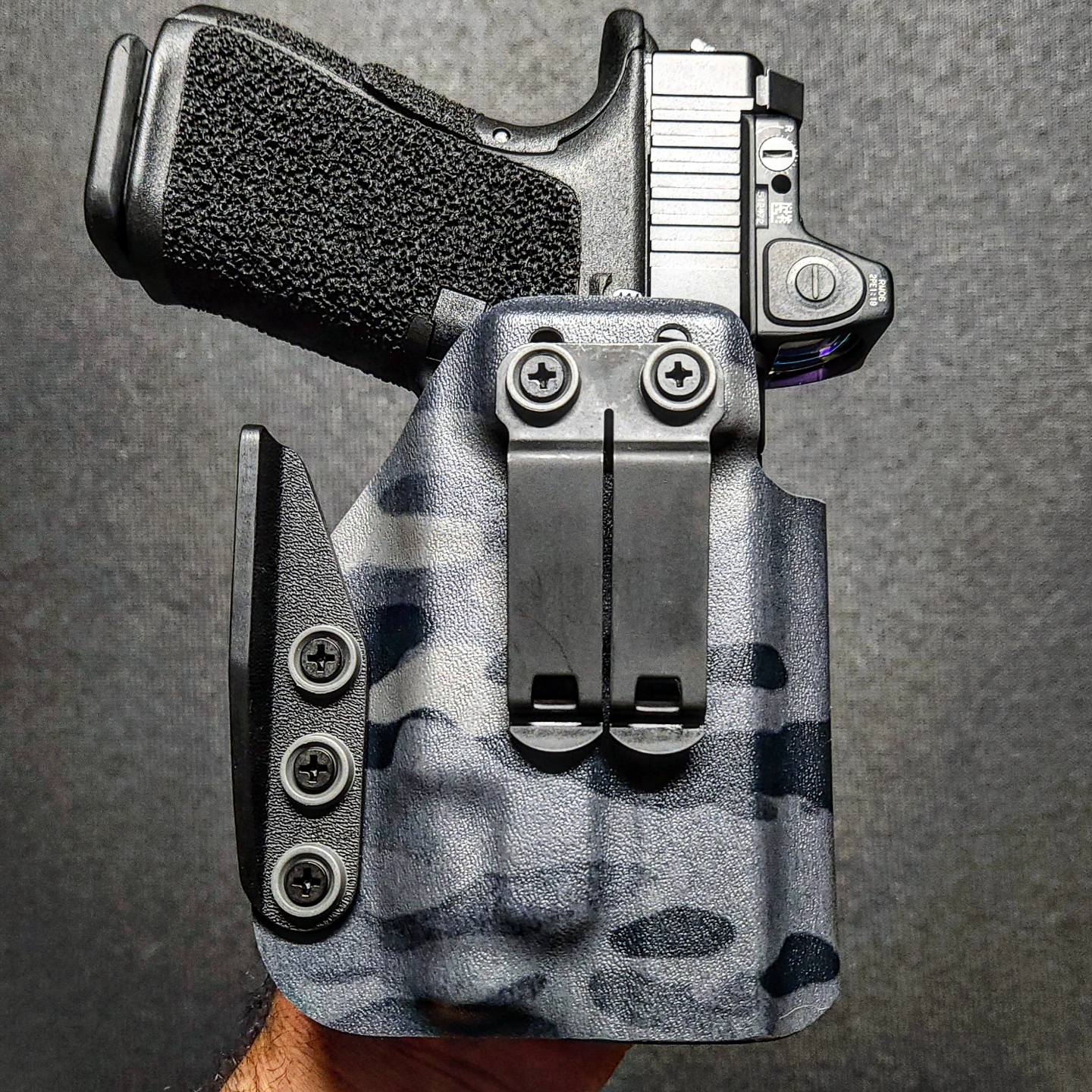 IWB Full-Size Weapon Light Indexing Holsters: $80 (plus shipping) Please email rfvtactical@gmail.com to place an order, or send us a message on Facebook or Instagram. Our Inside the Waistband (IWB) full-size weapon light indexing holsters are made with 0.080" thick Kydex in a variety of colors and prints. They are not specific to any particular gun, so they can be used with multiple guns that share the same weapon light. They are designed to fully encompass a Glock 17 size gun, but are open ended to work with longer guns or compensators. See our list of guns with verified fitment! They are molded specifically for the following popular full-size weapon mounted lights: Surefire X300 A/B Streamlight TLR-1 HL/HP/HLX/HPX Modlite PL350/350C Inforce WILD2 Olight PL-2/3/Pro and Baldr Pro R Nightstick TWM-30/TWM-850XL ![]() "Which full-size light is the best one?" ![]() ![]() ![]() ![]() ![]() ![]() "What is that round black thing on the back of the holster?" NOTE: Our full-size weapon light indexing holsters have a friction fit retention solely on the body of the light rather than a "click" retention. Be aware that because of the universal fit nature of these holsters, there maybe a little bit of play or movement of the gun when in the holster. See our available colors and graphic prints of Kydex Our AIWB holsters include a modified FOMI belt clip, a concealment wing, and a round rubber wedge. Optional belt clips include: Discreet Carry Concepts monoblock clip (additional $5) Two pull-the-dot soft loops (additional $10) ![]() ![]() ![]() Looking for a "side-car" style holster? We can attach our universal fit mag carrier to our full-size weapon light holsters at no additional charge when you purchase a mag carrier with the holster! ![]() ![]() ![]() IWB Compact Weapon Mounted Light Holsters: $80 (plus shipping) Please email rfvtactical@gmail.com to place an order, or send us a message on Facebook or Instagram. We also make IWB holsters for the following compact weapon mounted lights: Streamlight TLR-7 (A/X/HLX/Sub) Holosun P.ID (HC/Plus/Dual) Inforce WILD1, APLc, and APL Sig Sauer Foxtrot (1X/2/2R) Olight Baldr S, Baldr Mini, and PL-Mini2 Nightstick TCM-10/TCM-550XL ![]() "Which compact light is the best one?" ![]() ![]() ![]() ![]() ![]() ![]() "What is that round black thing on the back of the holster?" NOTE: Our compact weapon light holsters have a friction fit retention on the body of the light rather than a "click" retention. See our available colors and graphic prints of Kydex Also available as a "side-car" style holster with an integrated mag carrier! ![]() ![]() Compact weapon mounted light holsters are specific for the following handguns: See our review on most of the handguns listed below!