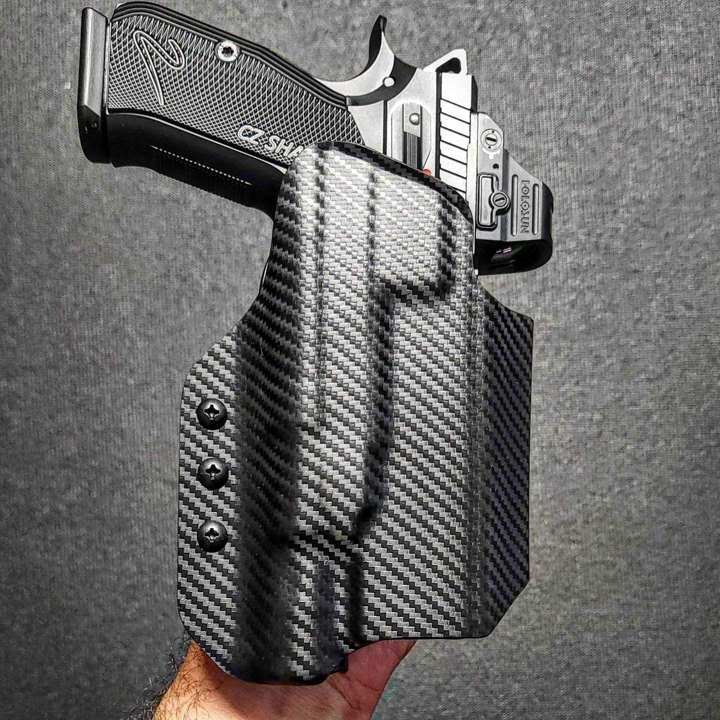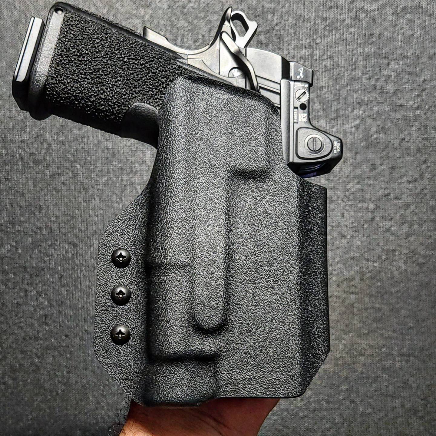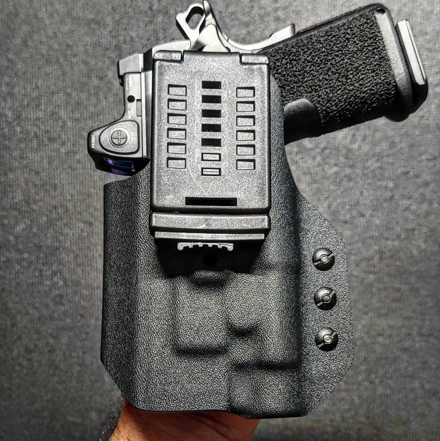 ![]() NOTE: Our full-size weapon light indexing holsters have a friction fit retention solely on the body of the light rather than a "click" retention. Be aware that because of the universal fit nature of these holsters, there may be a little bit of play or movement of the gun while it is in the holster. DISCLAIMER: These OWB holsters are NOT suitable as a duty style holster and should only be used for general range usage. See our available colors and graphic prints of Kydex OWB holsters include a DOTS Combat Loop belt attachment. This belt mount is similar to the BladeTech Tek-Lok mount, but is easier to lock once on the belt and unlock for removal. ![]() The mounting hole pattern also works with the Safariland QLS fork. IWB/OWB Combo Full-Size Weapon Light Indexing Holsters: $90 (plus shipping) Please email rfvtactical@gmail.com to place an order, or send us a message on Facebook or Instagram. Our full-size weapon light indexing holsters are also available as a dual purpose IWB/OWB combo version. They can be changed from IWB for concealed carry usage to OWB usage for competition or general range use in just a few minutes by simply installing the included OWB belt mount.