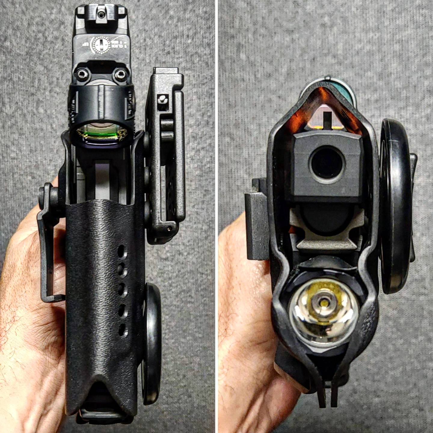 OWB Full-Size Weapon Light Indexing Holsters: $80 (plus shipping) Please email rfvtactical@gmail.com to place an order, or send us a message on Facebook or Instagram. Our full-size weapon light indexing holsters are also available as an Outside the Waistband (OWB) version. As with our IWB holsters, they are not specific to any particular gun, so they can be used with multiple guns that share the same weapon light. They are designed to fully encompass a Glock 17 size gun, but are open ended to work with longer guns or compensators. See our list of guns with verified fitment! They are molded specifically for the following popular full-size weapon mounted lights: Surefire X300 A/B Streamlight TLR-1 HL/HP/HLX/HPX Modlite PL350/350C Inforce WILD2 Olight PL-2/3/Pro and Baldr Pro R Nightstick TWM-30/TWM-850XL ![]() "Which full-size light is the best one?"
